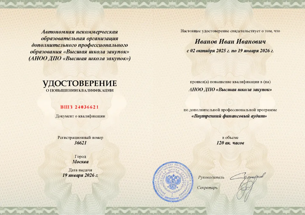 Повышение квалификации, 120 академических часов, 8 модулей: правовое регулирование и основы внутреннего финансового аудита, планирование и методика аудиторской проверки, выявление нецелевого использования средств и реализация результатов аудита. Онлайн-обучение в в Краснодаре с итоговой аттестацией.
