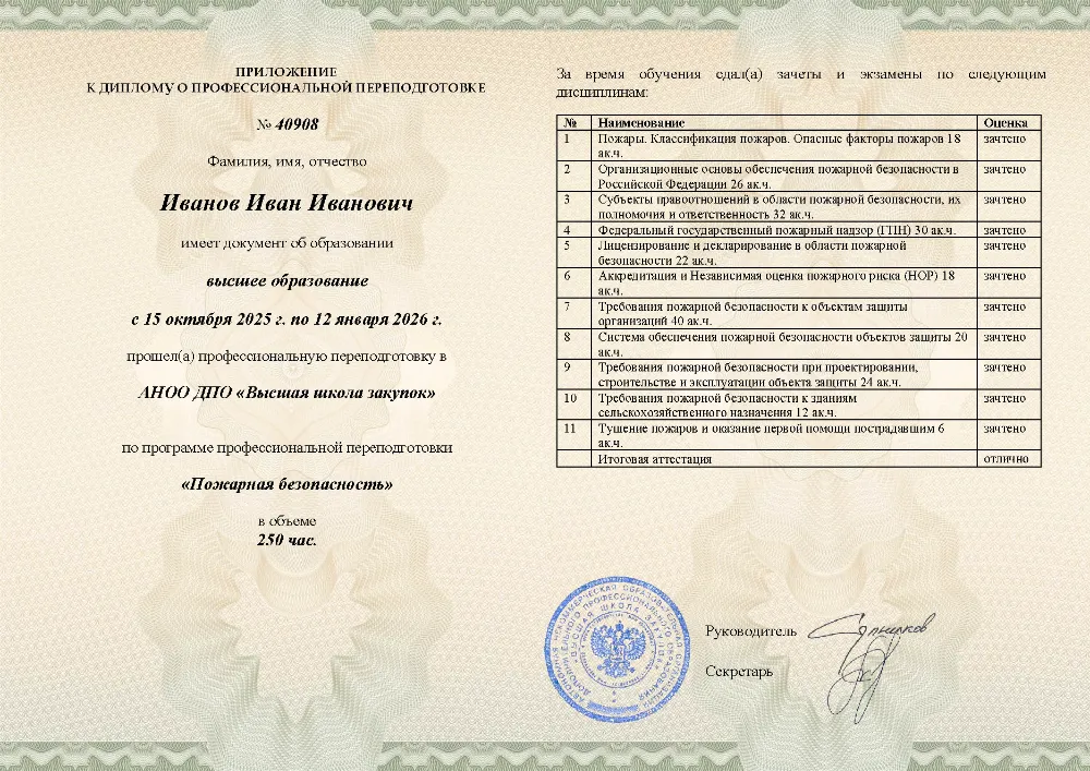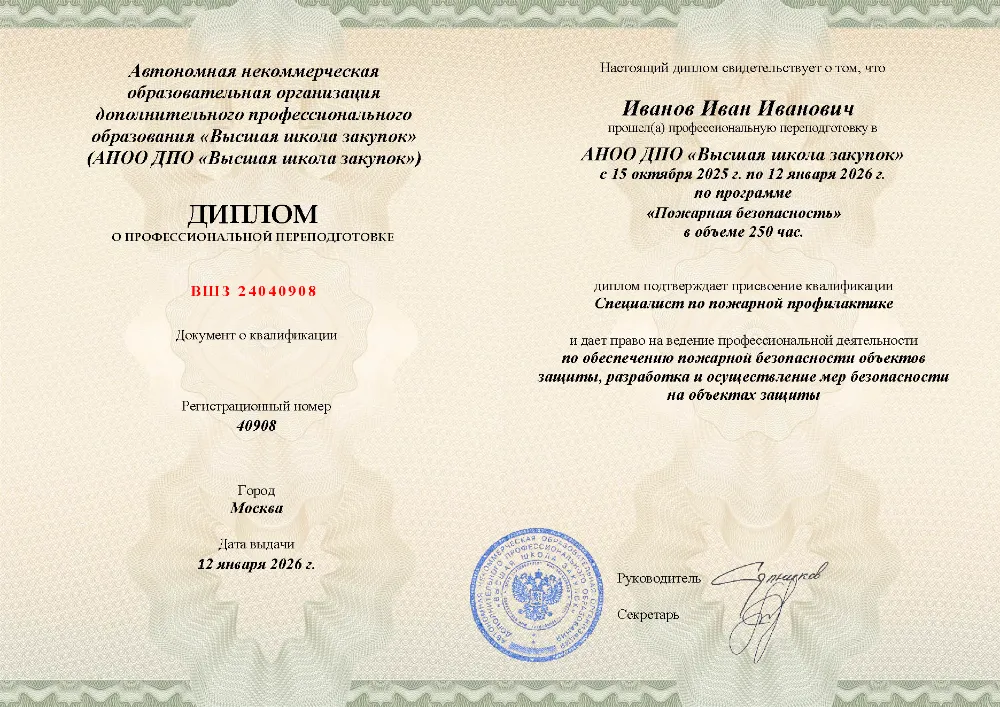 Профессиональная переподготовка, 250 академических часов, 11 модулей: организационные основы и законодательство в области пожарной безопасности, лицензирование и надзор, требования к объектам защиты, проектирование, тушение пожаров и оказание первой помощи пострадавшим. Онлайн-обучение в в Краснодаре с итоговой аттестацией.
