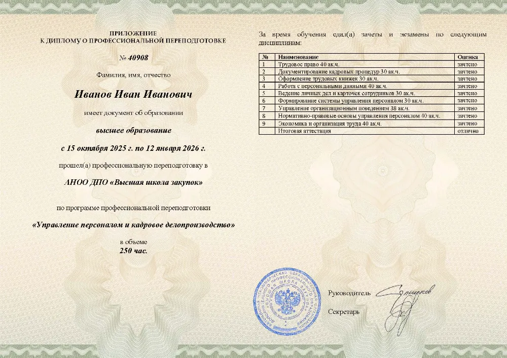 Профессиональная переподготовка, 250 академических часов, 19 модулей: трудовое законодательство и кадровое делопроизводство, подбор, мотивация и оценка персонала, психология менеджмента и разрешение конфликтов, автоматизация документооборота и работа с персональными данными. Онлайн-обучение в в Краснодаре с итоговой аттестацией.