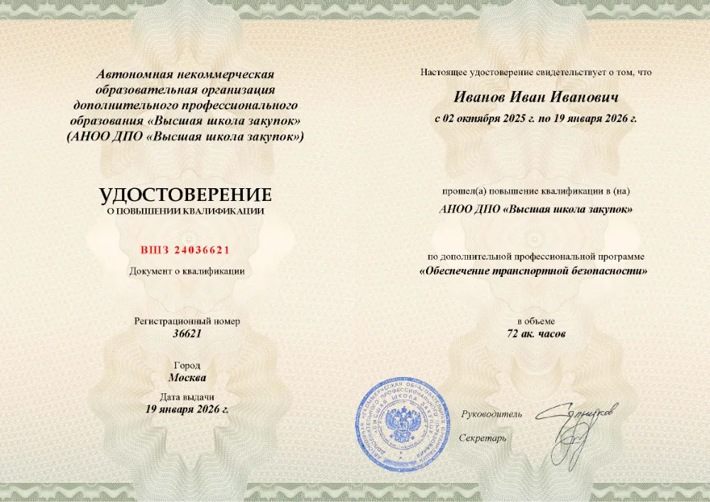 Повышение квалификации, 72 академических часа, 10 модулей: нормативная правовая база и система мер обеспечения транспортной безопасности, планирование и реализация защитных мероприятий, информационное обеспечение и государственный контроль, оценка состояния защищенности объектов. Онлайн-обучение в в Краснодаре с итоговой аттестацией.
