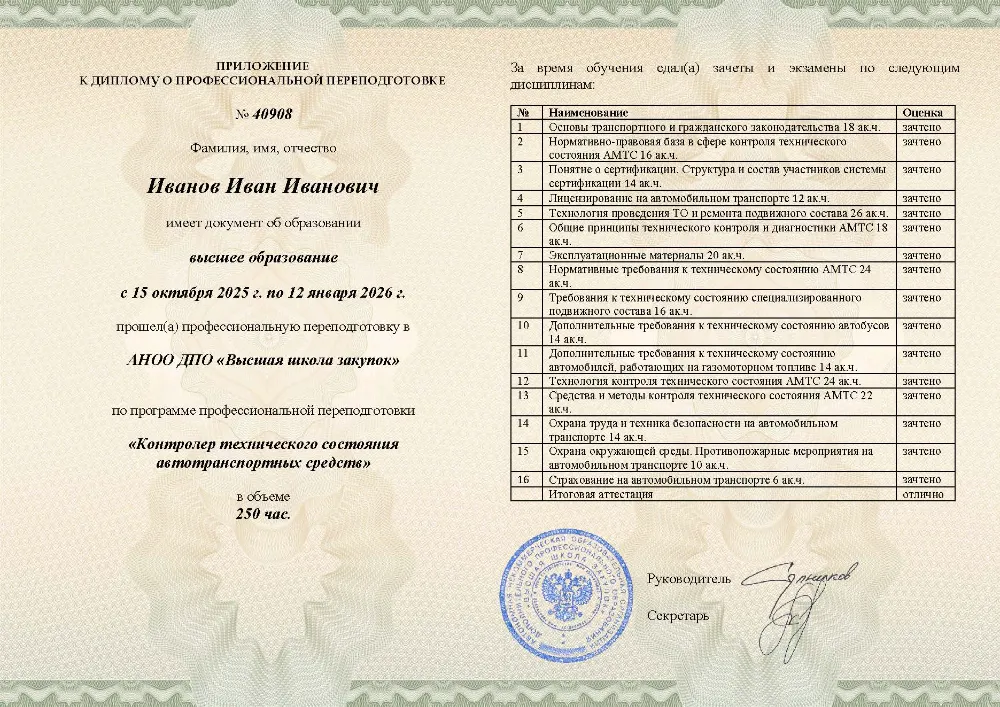 Повышение квалификации, 72 академических часа, 4 модуля: нормативные требования к техническому состоянию транспорта, технология и методы контроля, оценка состояния специализированного подвижного состава и автобусов, охрана труда и техника безопасности. Онлайн-обучение в в Краснодаре с итоговой аттестацией.